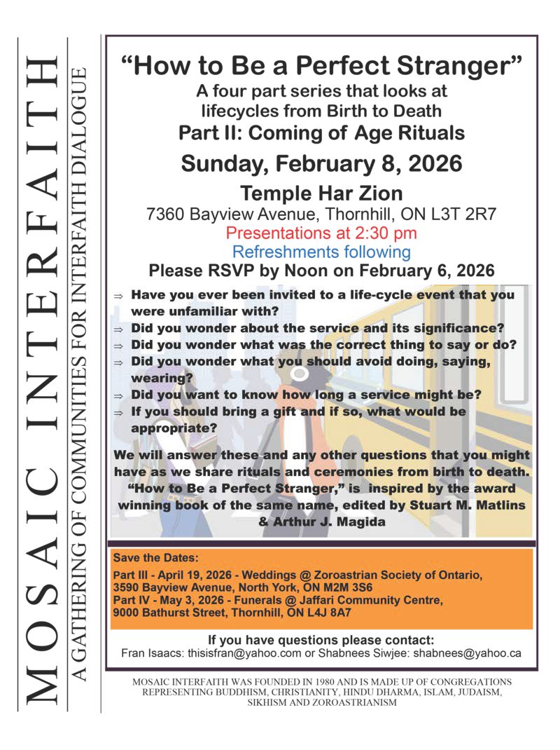 This year Mosaic Interfaith is hosting a series of sessions centred on lifecycles from birth to death. In this second of a four-part series, a panel of four speakers from Zoroastrianism, Islam, Judaism, and Christianity will offer reflections and answer questions on the rituals and ceremonies in their respective religious traditions and meanings. Refreshments will follow.